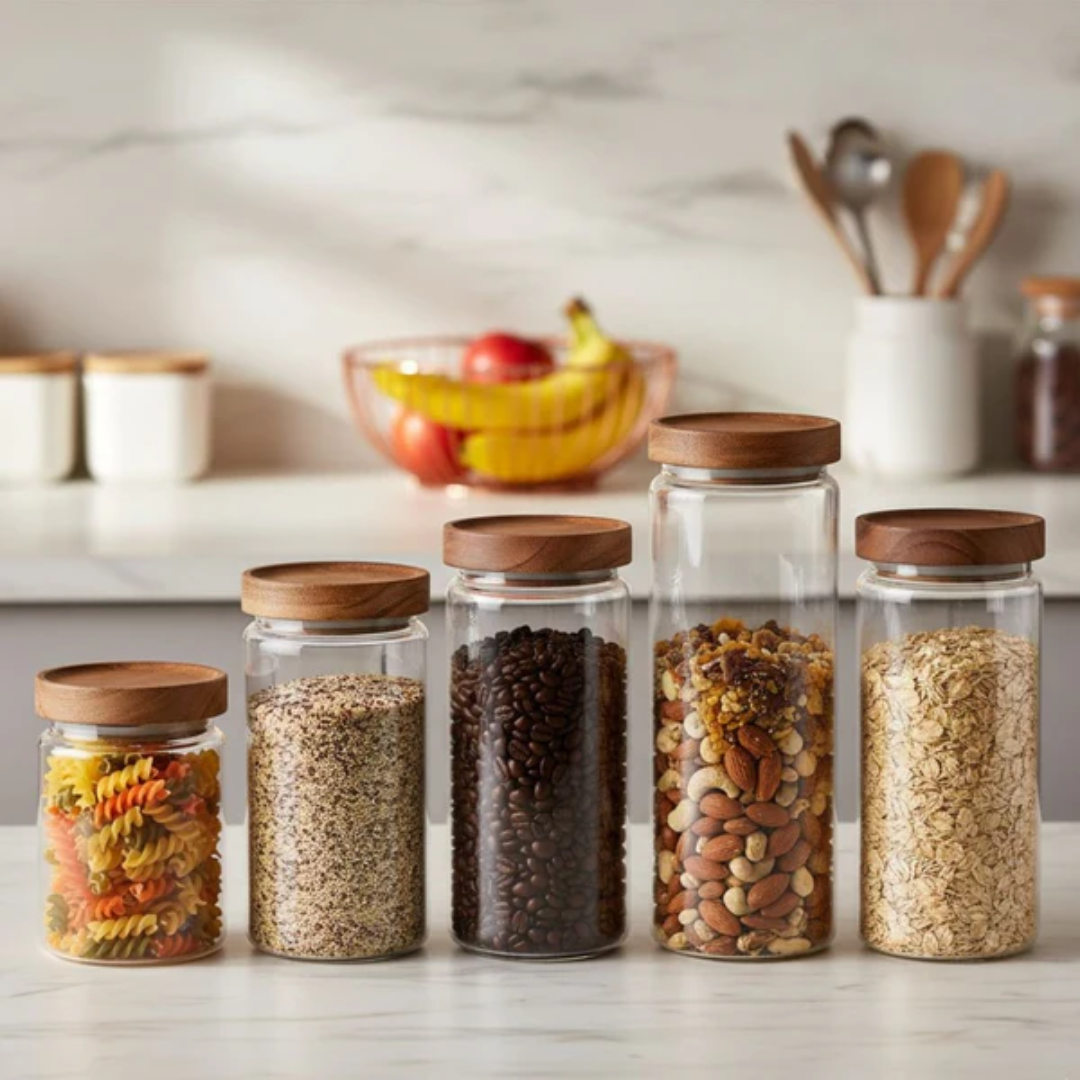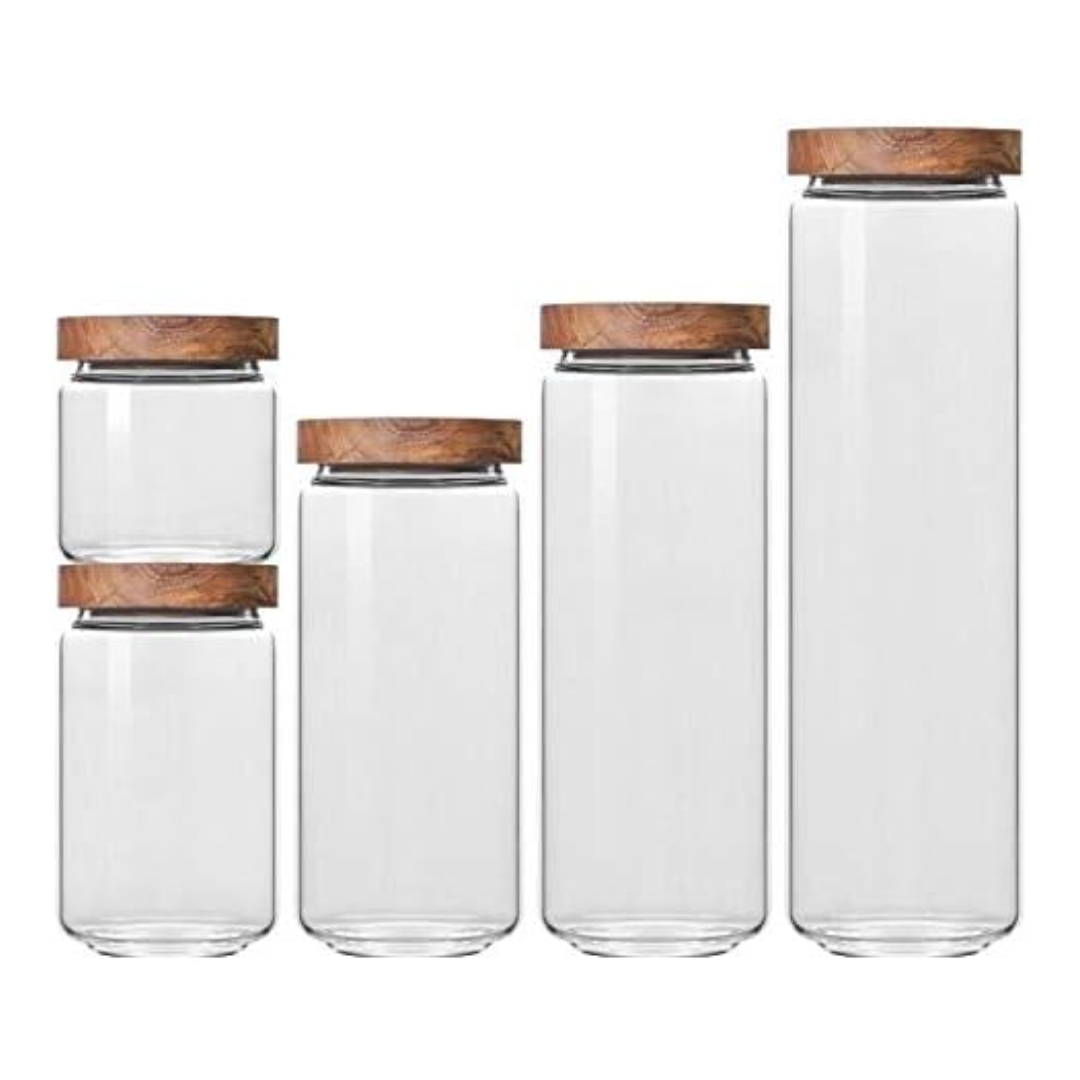 5 Contenedores de vidrio con tapa de Madera de acacia