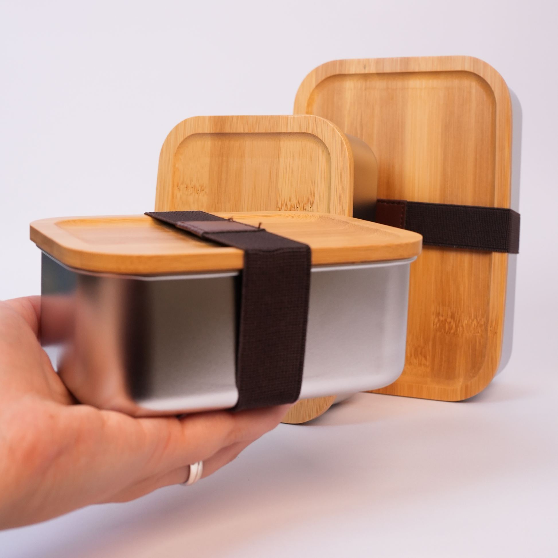 Kit De 3 Porta Comida En Acero Con Tapa De Bambú + Precinto Elástico