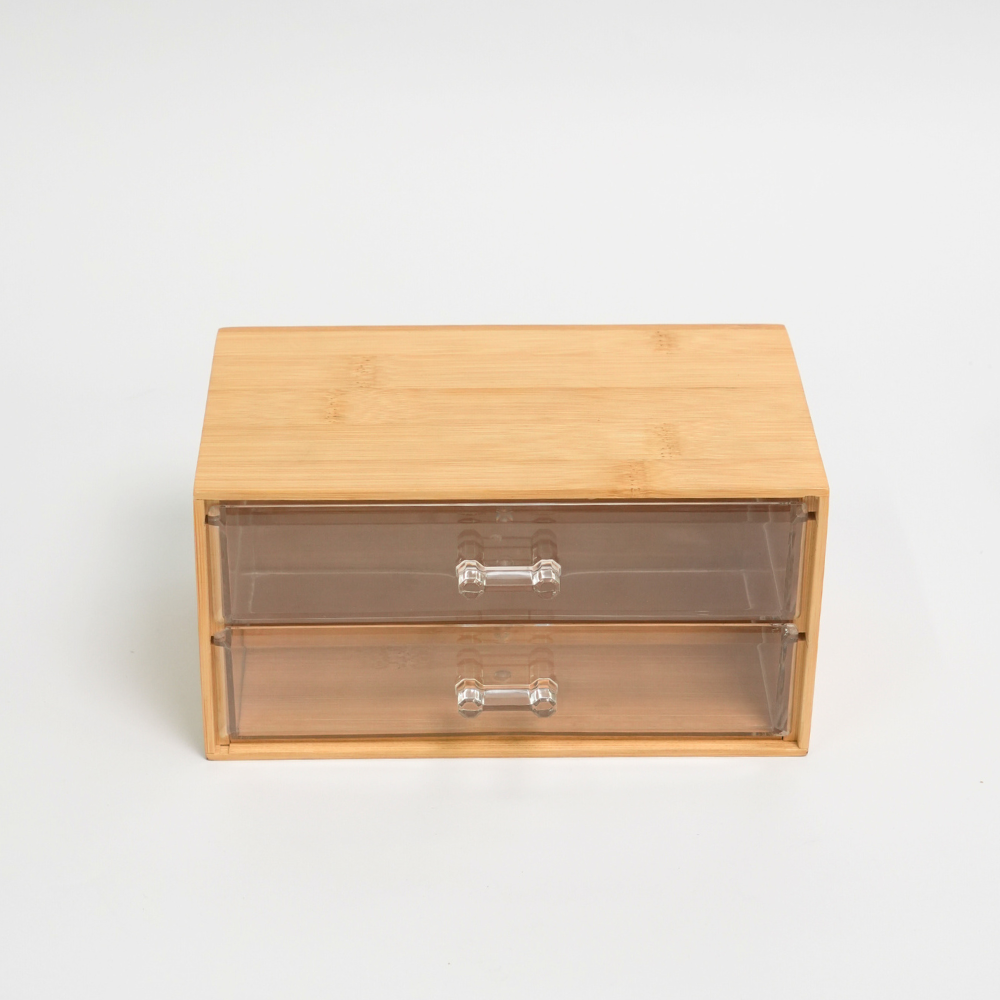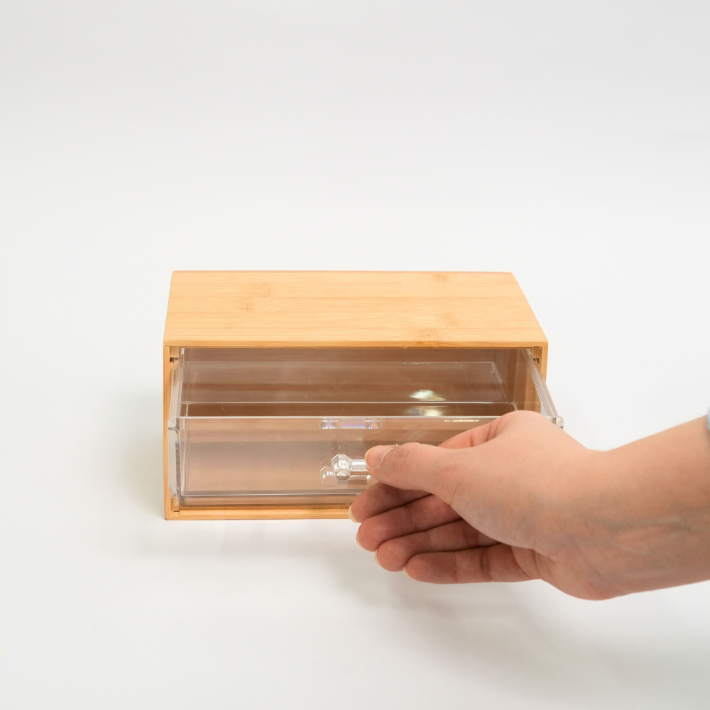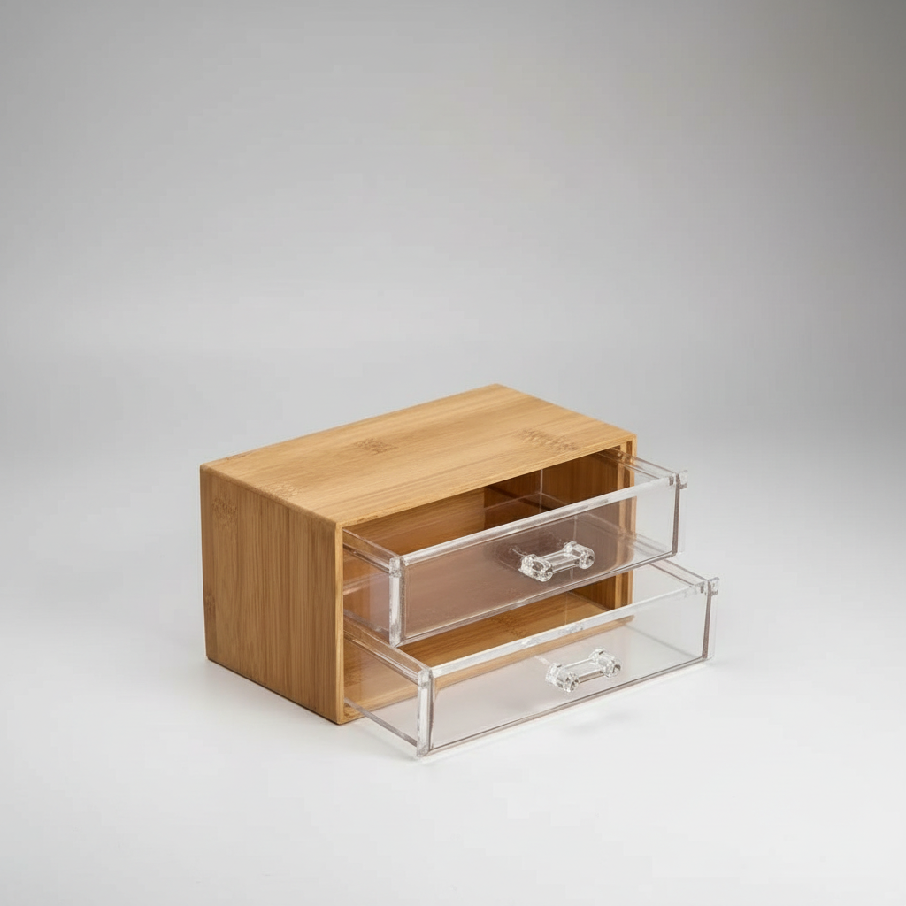 Este organizador de maquillaje combina bambú y cajones acrílicos para que tengas todo en su lugar y fácil de ver. Es ideal para guardar brochas, labiales, cremas o accesorios sin desorden, aprovechando bien el espacio y manteniendo tu tocador, baño o escritorio siempre bonito y organizado.