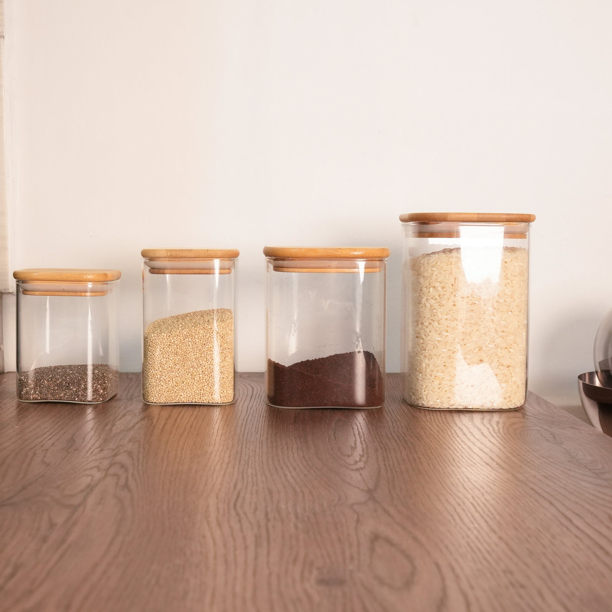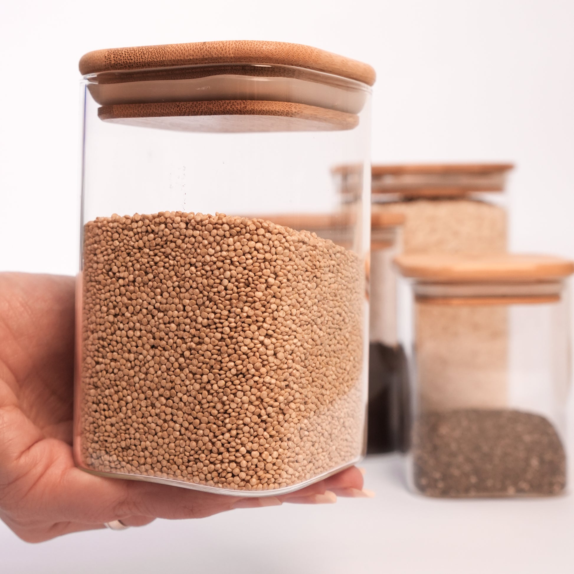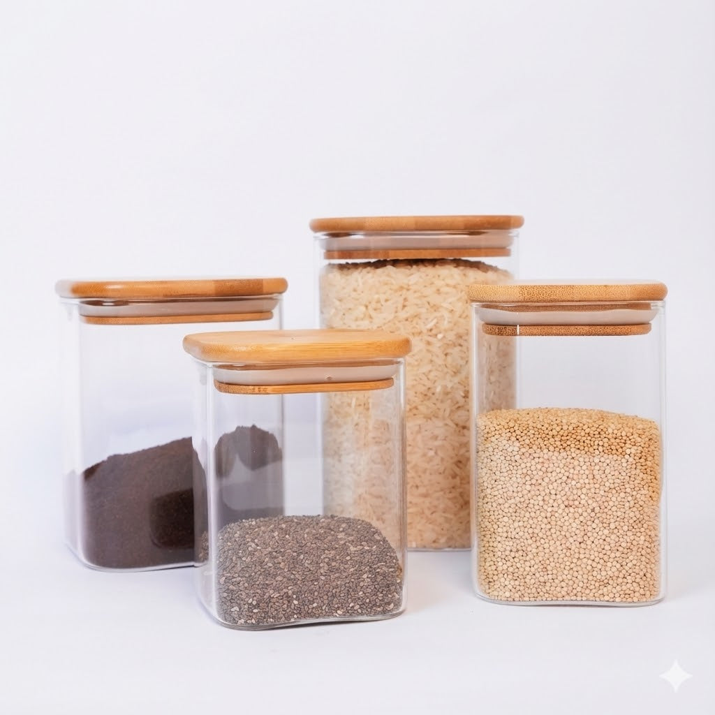 Crea una Cocina Bonita & Saludable con frascos de vidrio herméticos y tapa de bambú que mantienen tus alimentos frescos, libres de humedad y protegidos de plagas. Su diseño elegante transforma tu cocina en un espacio limpio, organizado y moderno sin hacer grandes cambios.